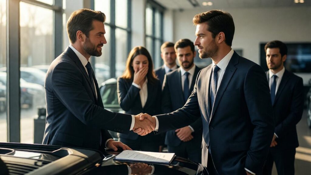 A company representative announced: “This is Mr. Enzo Rossi, one of our largest partners in Florida. He is here today to finalize a long-term fleet purchase.”
