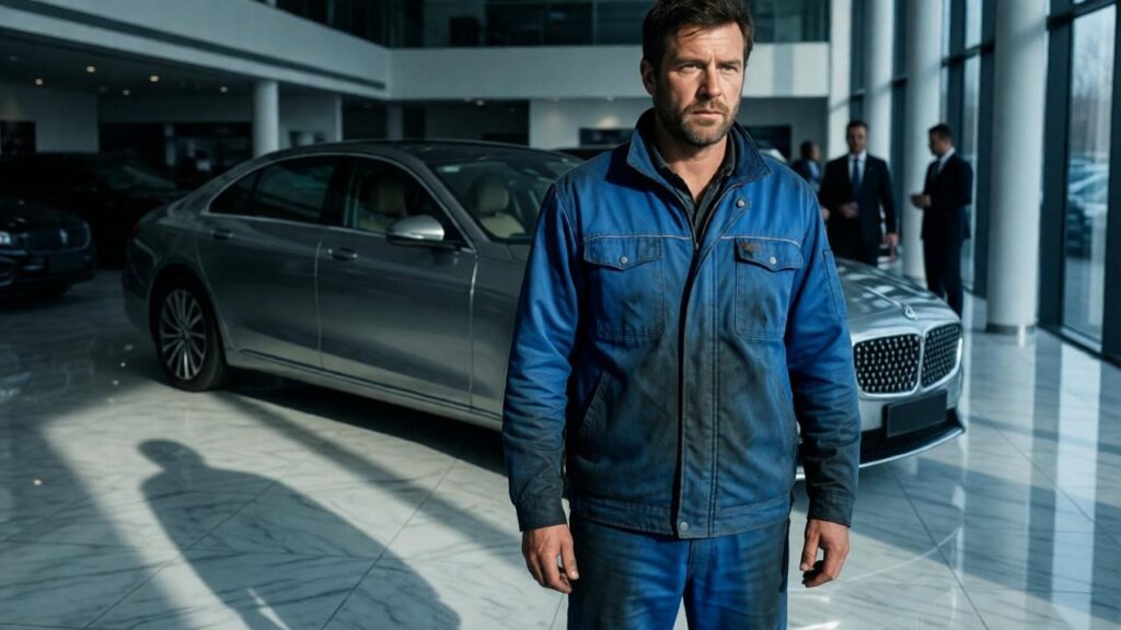 The luxury car showroom was quiet that morning, polished floors reflecting rows of gleaming vehicles worth more than most houses. When the man entered, no one greeted him. He wore an oil-stained work jacket, his hands rough from years of honest labor. He stood near a sleek sports car and spoke politely.